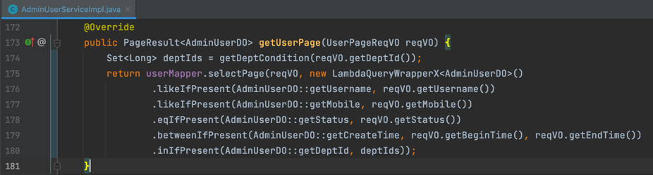 继承 MyBatis Plus 的条件构造器,拓展了 LambdaQueryWrapperX (opens new window) 和 QueryWrapperX (opens new window) 类,主要是增加 xxxIfPresent 方法,用于判断值不存在的时候,不要拼接到条件中。例如说: