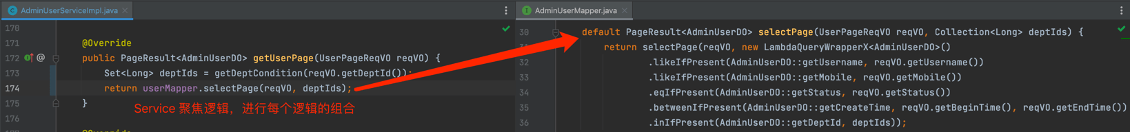 并且,通过只允许将 MyBatis Plus 操作编写 Mapper 层,更好的实现 SELECT 查询的复用,而不是 Service 会存在很多相同且重复的 SELECT 查询的逻辑。